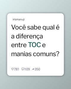 🤔 Você sabe diferenciar TOC de manias comuns? Descubra agora! 🔄 Muitas pessoas utilizam o termo TOC de forma errada, associando-o a manias do dia a dia, porém, há uma
